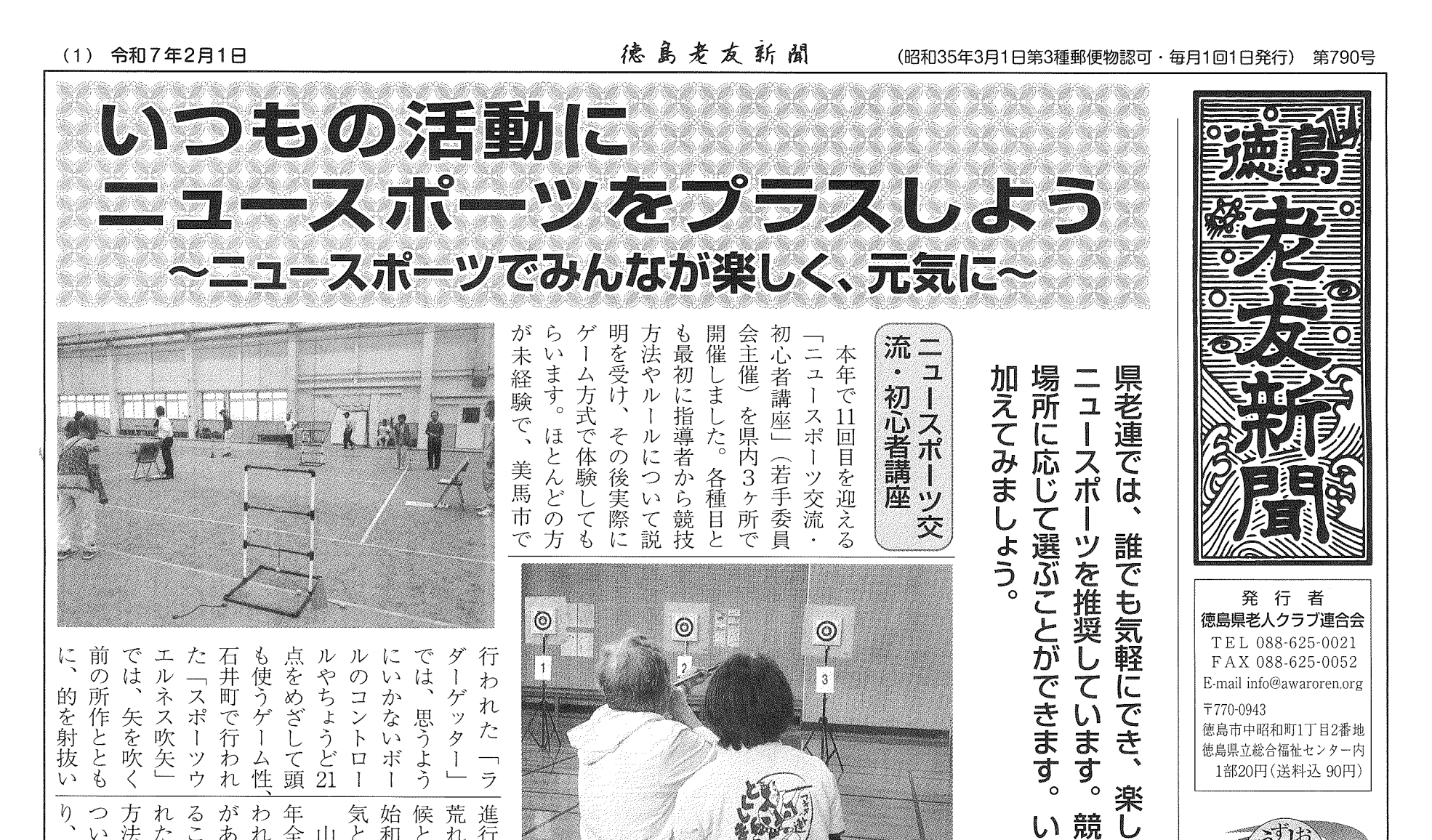 第790号令和7年(2月1日)いつもの活動にニュースポーツをプラスしよう 2025 5/22 徳島老友新聞 2025年5月22日 県老連では、誰でも気軽にでき、楽しみながら健康づくりにも役立つニュースポーツを推奨しています。競技の種類も豊富で、人数や体力、場所を応じて選ぶことができます。いつもの活動にニュースポーツを加えてみましょう。 全文を見る 徳島老友新聞 関連記事 第798号令和7年(10月1日)入ってみようと思われる老人クラブをめざして〜中国四国ブロック老人クラブリーダー研修会に参加しました〜 2026年3月4日 第797号令和7年(9月1日)老人クラブの仲間をふやそう!!〜秋は仲間をふやす季節です〜 2026年3月4日 第796号令和7年(8月1日)県老連の新しい役員体制がスタート!〜理事会・評議委員会を開催〜 2025年11月29日 第795号令和7年(7月1日)徳島県が全国に誇る友愛訪問活動〜友愛訪問員知事激励式が開催されました〜 2025年11月29日 第794号令和7年(6月1日)大阪・関西万博が開催中です〜きたぞ、万博!いくぞ、徳島!〜 2025年9月12日 第793号令和7年(5月1日)令和7年度事業計画および予算を決定〜第36回理事会を開催〜 2025年9月12日 第792号令和7年(4月1日)若手の加入促進に向けて意見交換〜若手委員が香川県老連との交流学習に参加〜 2025年7月17日 第791号令和7年(3月1日)楽しい活動、楽しいクラブ、楽しい日本♪〜市町村老連役員等研修会を開催〜 2025年6月18日